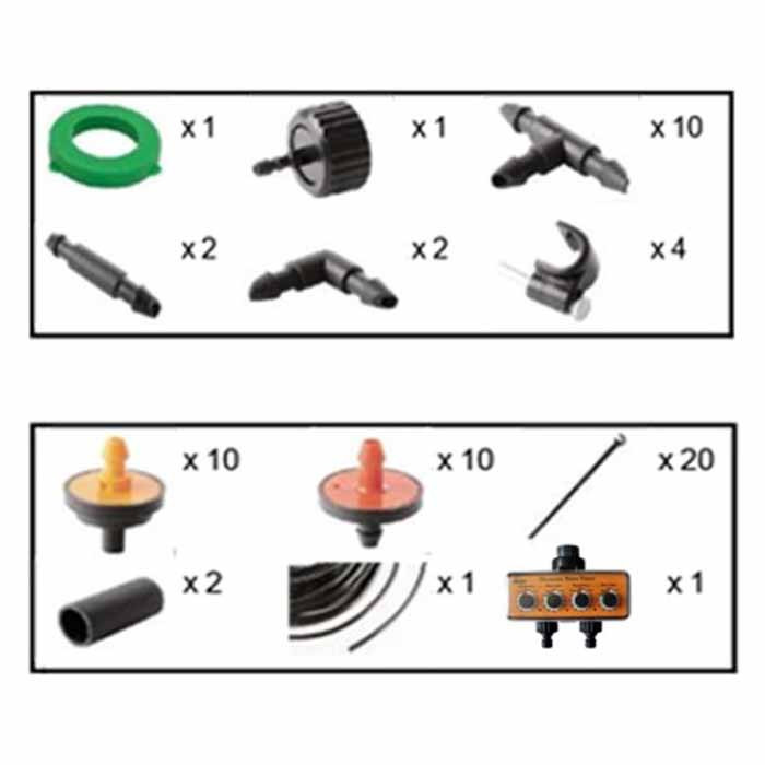 به همراه تمامی قطره چکان ها، اتصالات و رابط و قطعات آبیاری قطره ای.