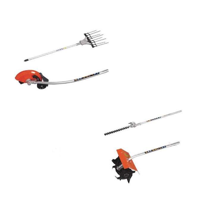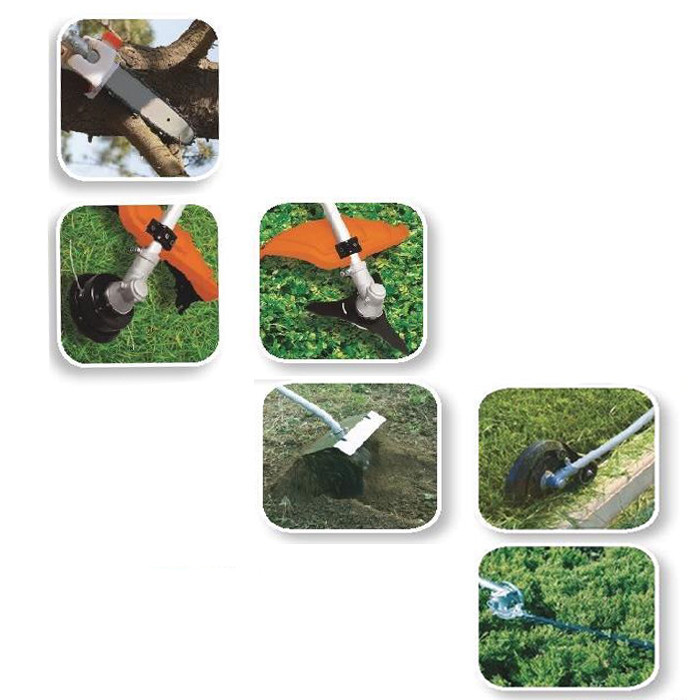 دستگاه چندکاره شامل هد شمشادزن، اره شاخه بر، علفزن، شیکر، روتیواتور و کناره بر چمن